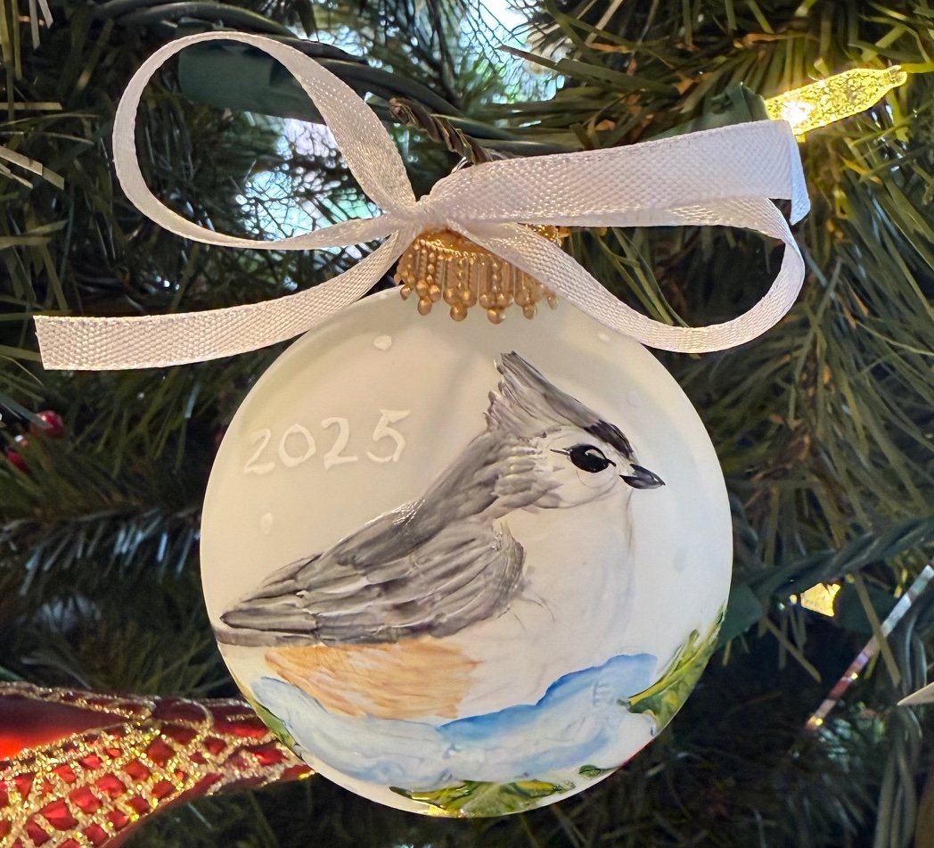 Tufted Titmouse on a frosted glass ball.