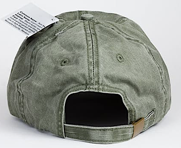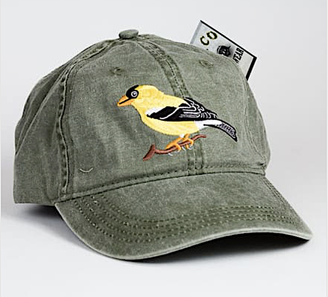 American Goldfinch on a greenish/tan denim cap. Adjustable strap with clasp. One size fits most.