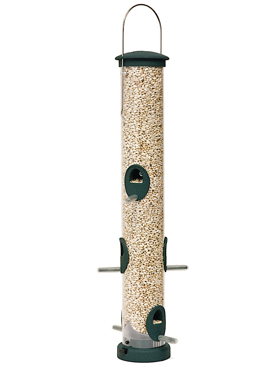 This Aspects Quick-Clean feeder has 6 ports. The clever quick-clean bottom has two tabs to push in and take the entire bottom off easy for cleaning. Seed deflector at the bottom keeps seed flowing to the bottom ports without falling out. Stainless steel hardware. The tube is 18 inches long. A very well-made feeder.