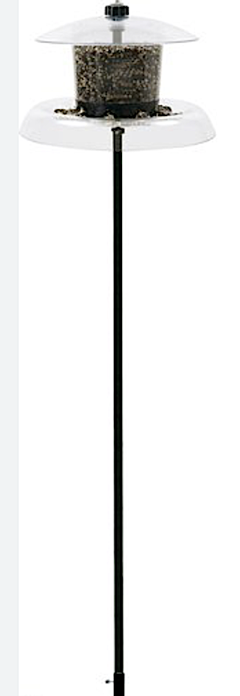The large hopper holds a ton of seed, the cover helps keep seed dry, there are 8 feeding stations but the birds can eat seed from any place on the tray. The giant seed tray also serves as a squirrel baffle (don’t put it on upside down). The pole is 5 1/2 feet and fits into the ground auger which is also included! It’s made in Connecticut.